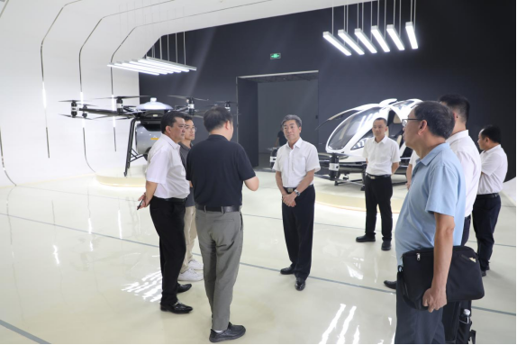 调研组一行首先来到云浮亿航智能技术有限公司(以下简称为“亿航公司”)展厅了解亿航公司发展情况,工作人员在产品模型展示区为调研组介绍项目产品、技术成品和市场推广等情况。调研组通过听取汇报、现场参观和询问等方式,与企业负责人进行交流,详细了解企业安全生产、生产规模、产值产能、税收、生态环保、要素保障等情况,现场协调帮助解决企业发展过程中遇到的困难和问题。