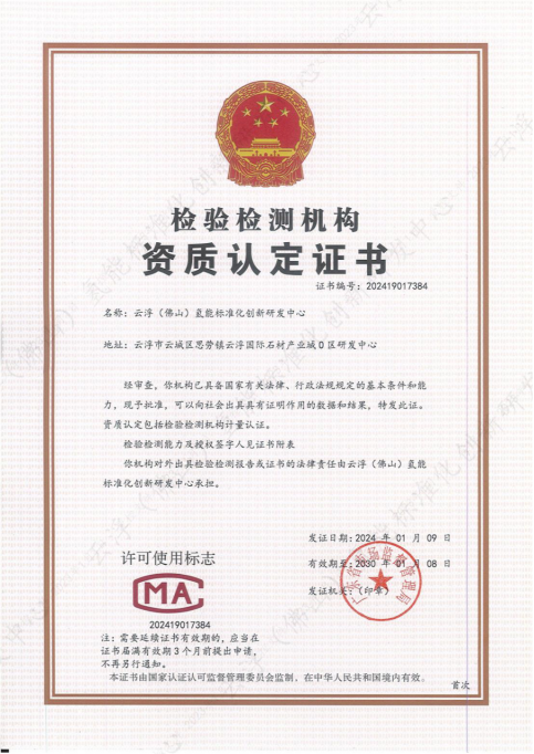 2024年1月9日,佛山(云浮)产业转移工业园管理委员会下属事业单位云浮(佛山)氢能标准化创新研发中心(以下简称氢标中心)顺利通过广东省检验检测机构资质认定评审,成功获得广东省市场监督管理局颁发的检验检测机构资质认定证书(CMA证书)!