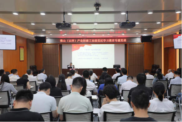 为深入学习贯彻中央、省委、市委关于党纪学习教育的部署要求,推动党纪学习教育走深走实,持续引导党员干部学纪、知纪、明纪、守纪。6月6日上午,佛山(云浮)产业转移工业园(以下简称园区)邀请市纪委监委驻市工信局纪检监察组组长陈伟春解读新修订的《中国共产党纪律处分条例》。会议由园区党工委委员袁勇军主持,园区党工委书记、管委会主任杨洪委和其他领导班子成员、全体干部职工,园区机关支部全体党员参加学习。