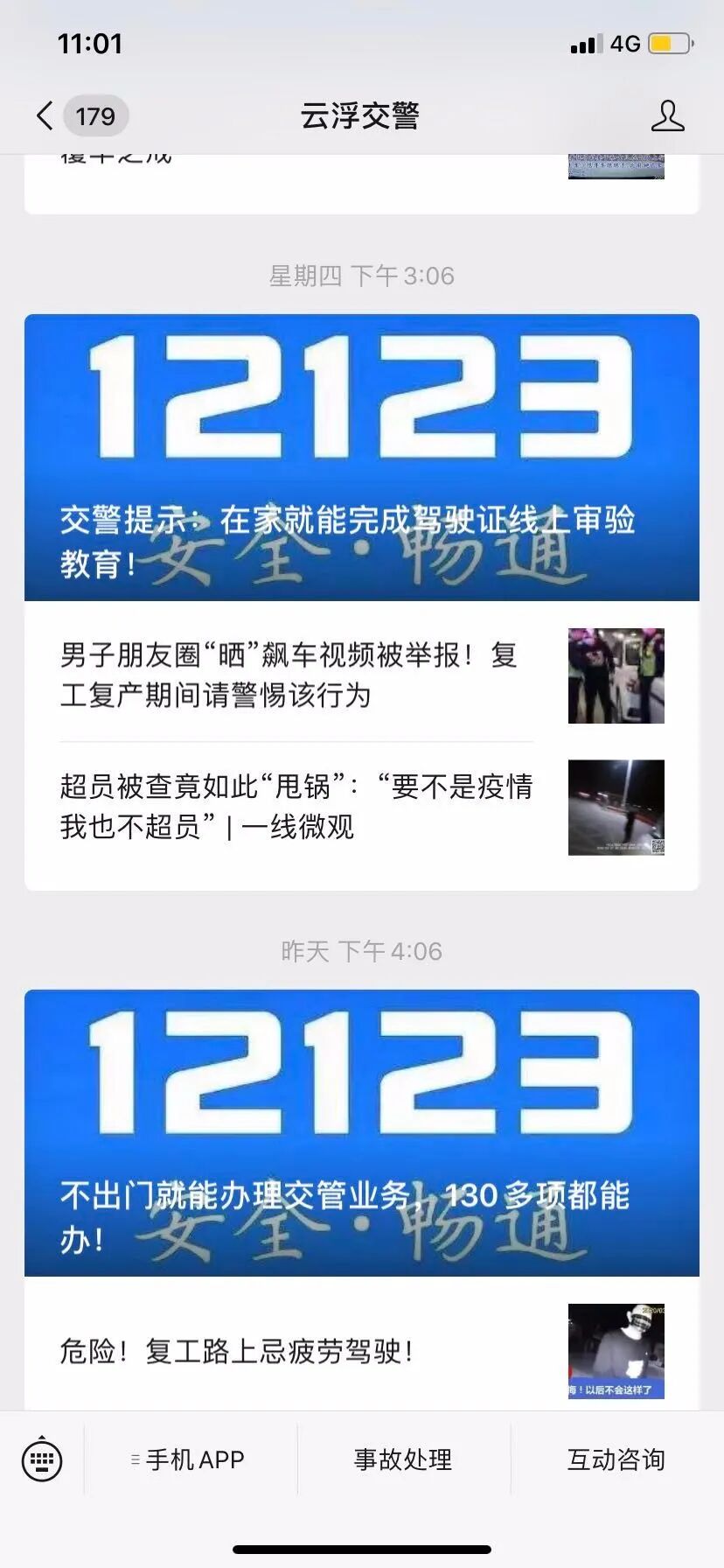 12.在“云浮交警”微信公众号转发上级关于疫情期间车驾管业务办理及保险理赔业务惠民措施解读,扩大政策社会知晓度,确保企业员工驾车出行等复工复产需求。