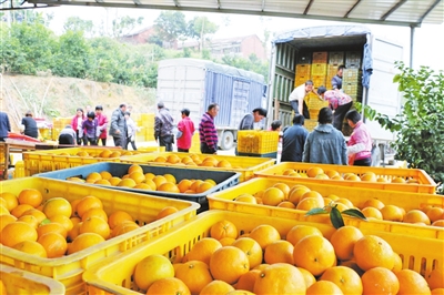 1月9日下午,新兴县天堂镇粤天果蔬合作社的皇帝柑种植基地,果农们把一筐筐的皇帝柑装运上车,现场一派热火朝天的忙碌景象,金灿灿的皇帝柑和果农们的笑脸相辉映。皇帝柑将通过汽车先运到肇庆市,再转火车北上北京市,实现“南果北运”助农增收。