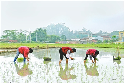 3月24日下午,新兴县太平镇江上垌的“云浮市优质高产水稻示范片”田间地头,农民们或使用小型农机耙田,或勤快地插秧抛秧,或给刚种下不久的禾苗追施复合肥……时值春分前后,雨水充沛,新兴县各地农民抓紧农时积极投身农业生产,田间地头一片忙碌的生产景象。 (通讯员 黎居雄 摄影报道)