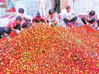 前来出售荔枝的果农络绎不绝,荔枝收购点的工人则忙个不停,过秤、装箱、冷处理、装车等工序有条不紊地进行。“黎少镇的荔枝品质好,十分畅销,我们每年都过来收购。今年收购价格比较高,平均每斤6元左右,现在每天收购一万多斤,近半个月来已收购十几万斤了。”收购商陈先生告诉记者。