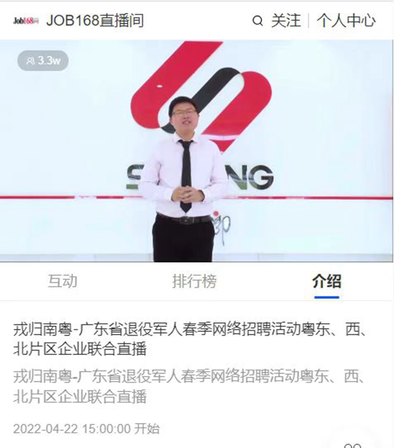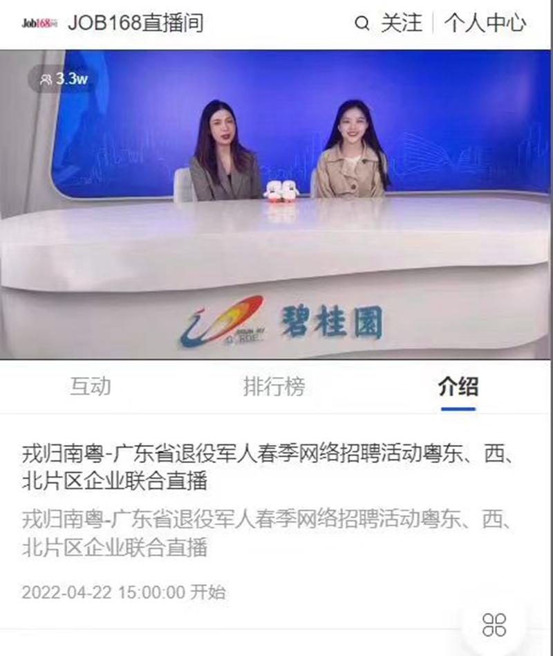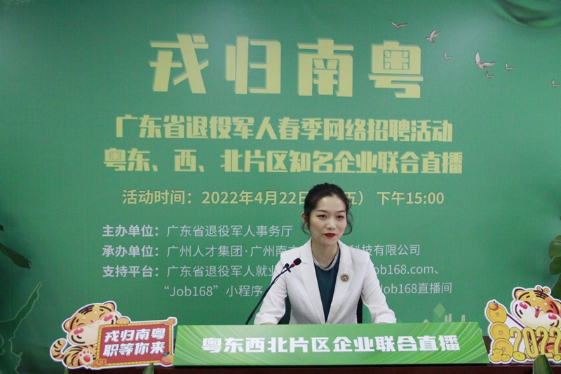 4月22日,广东省退役军人事务厅举办的“戎归南粤——广东省退役军人春季网络招聘活动之粤东西北片区专场直播带岗活动”正式启动,来自粤东、西、北的6家知名企业参与活动、直播带岗,另有300家企业、10000个岗位同步上线。