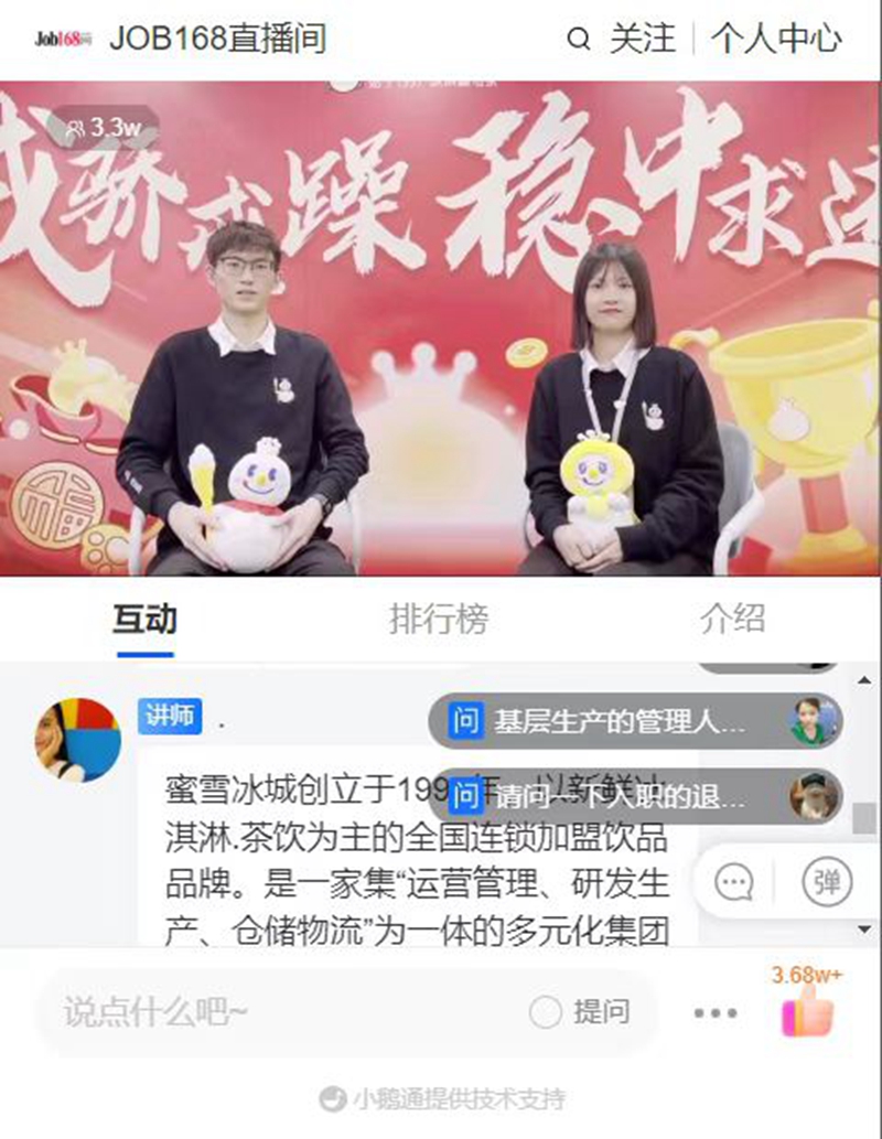 值得留意的是,本次直播突破了以往较为单一的企业岗位播报,采取了网络主播“云探访”企业及企业主、人事经理的创新形式,与在企业内部直播带岗的模式相结合,实现网络主播“云”带领观众体验企业实地环境,打造“沉浸式”观赏。