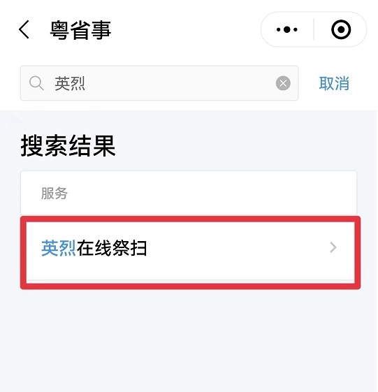 微信登录粤省事,在首页搜索栏输入“英烈在线祭扫”