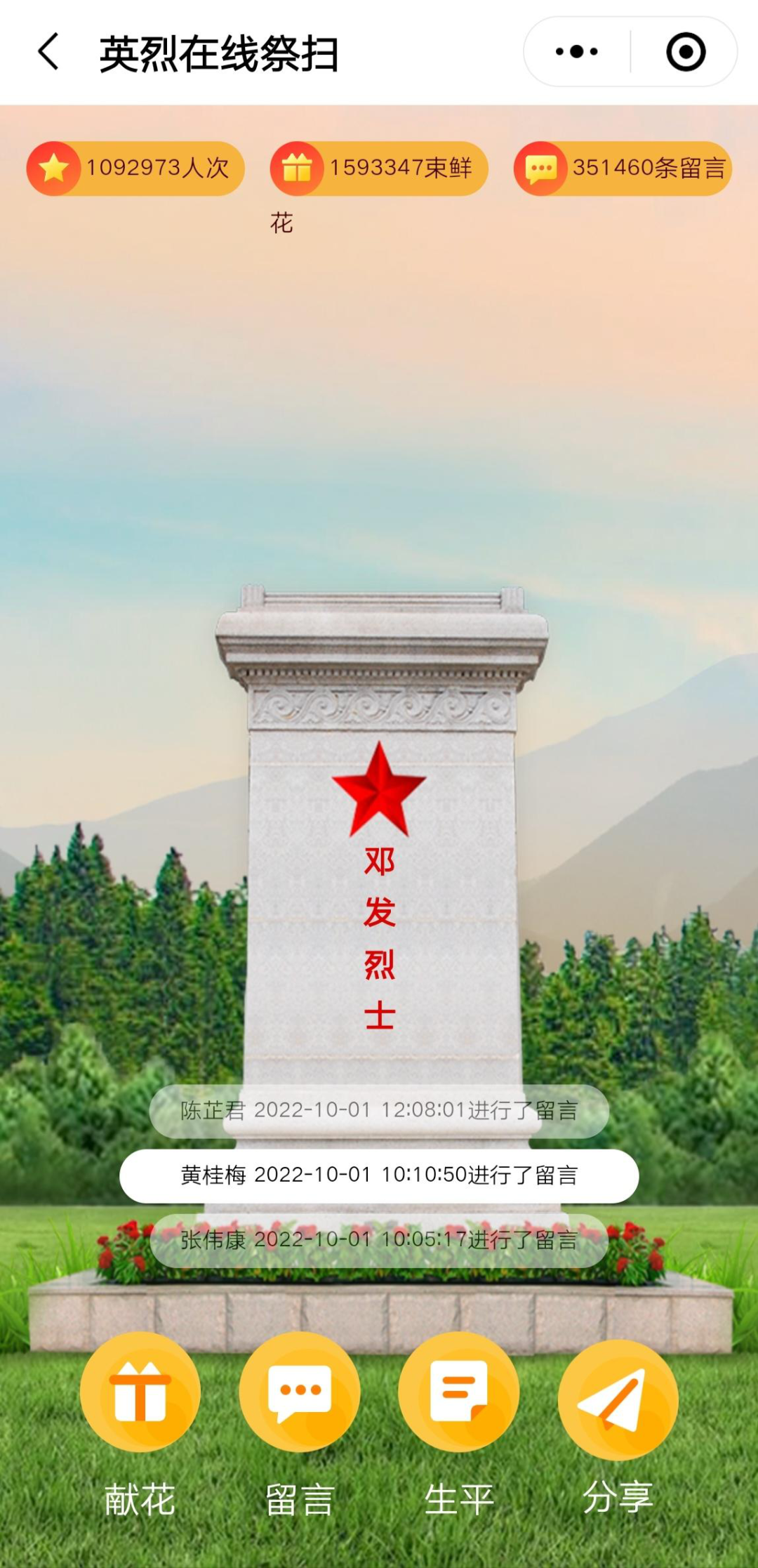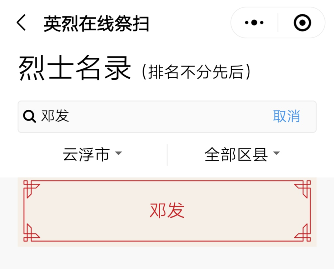 点击进入英烈在线祭扫服务后,选择“云浮市”,可见云浮籍烈士名录,也可以搜索烈士英名查询,选择其中一烈士姓名点击打开,即可点击下方进行献花、留言、查看生平及分享等操作。