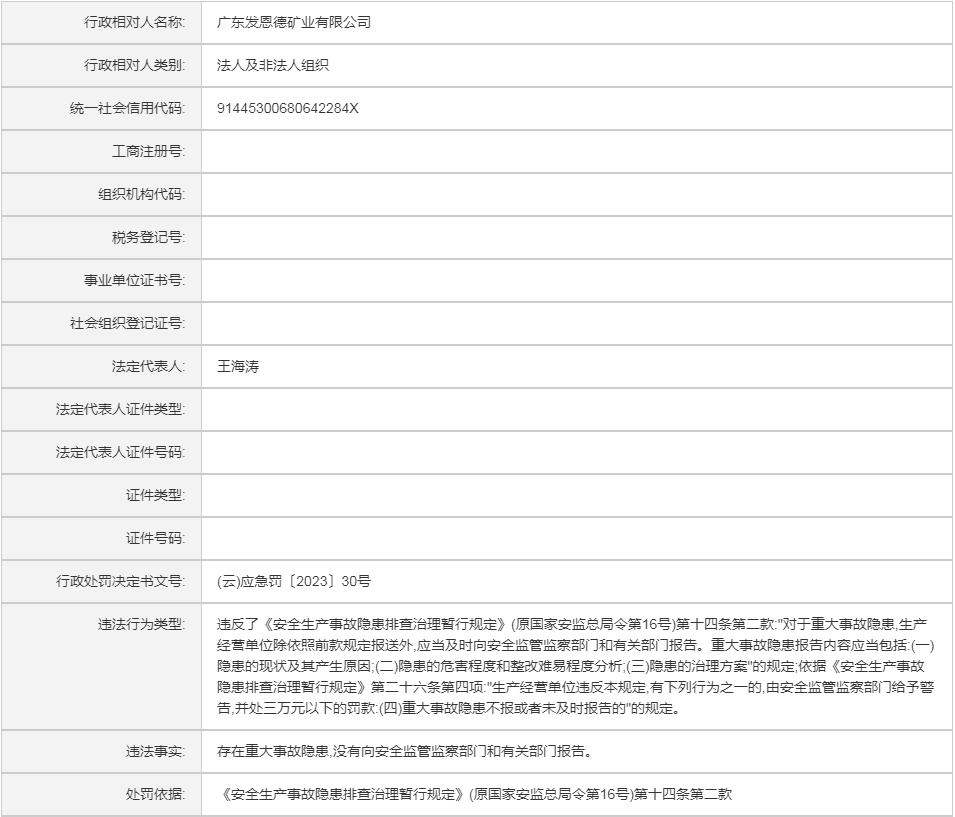 (云)应急罚〔2023〕30号广东发恩德矿业有限公司行政处罚案