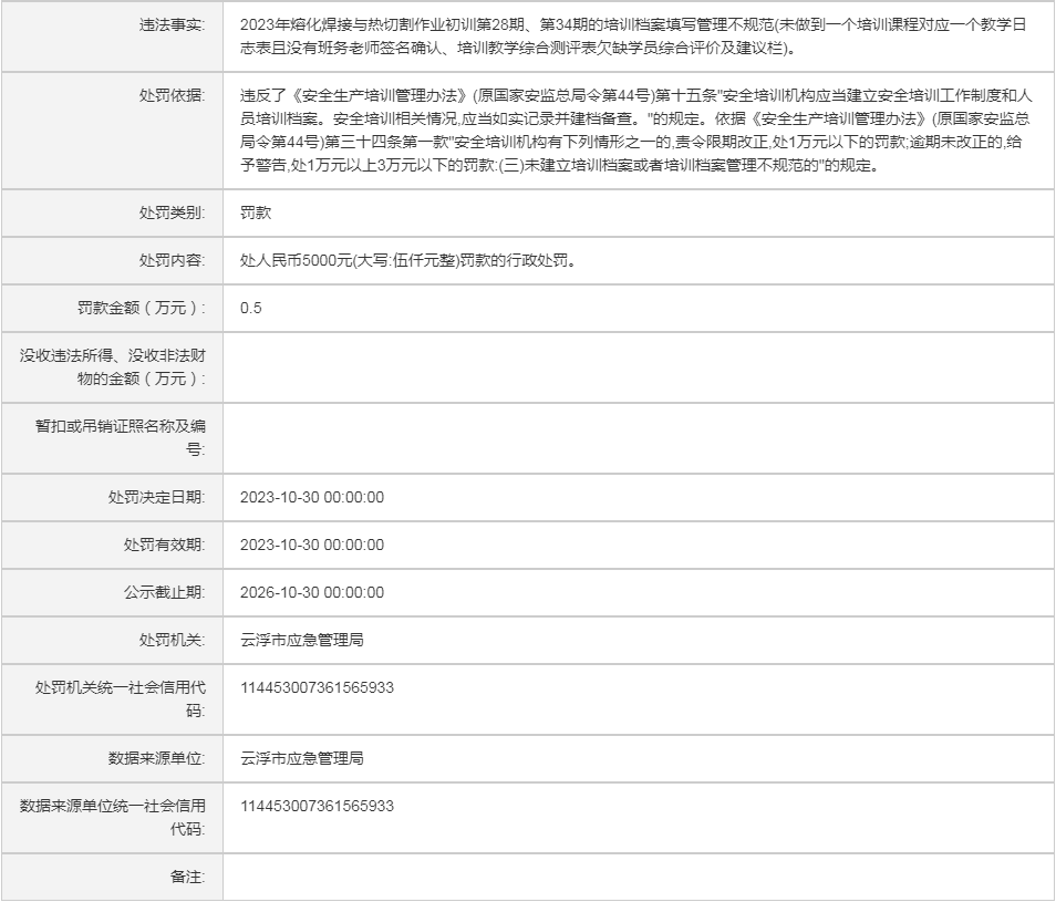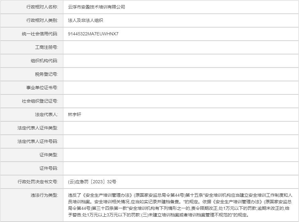 (云)应急罚〔2023〕32号云浮市安盈技术培训有限公司行政处罚案