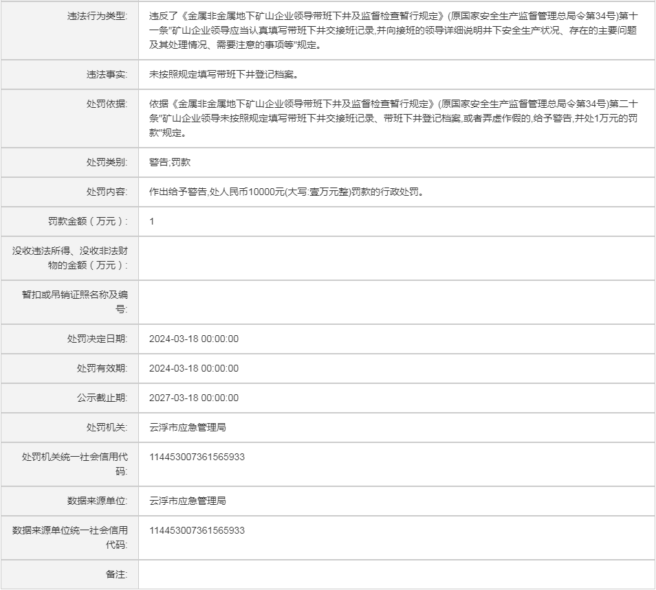 (云)应急罚〔2024〕33号中电建(云浮)绿色矿业有限公司行政处罚案