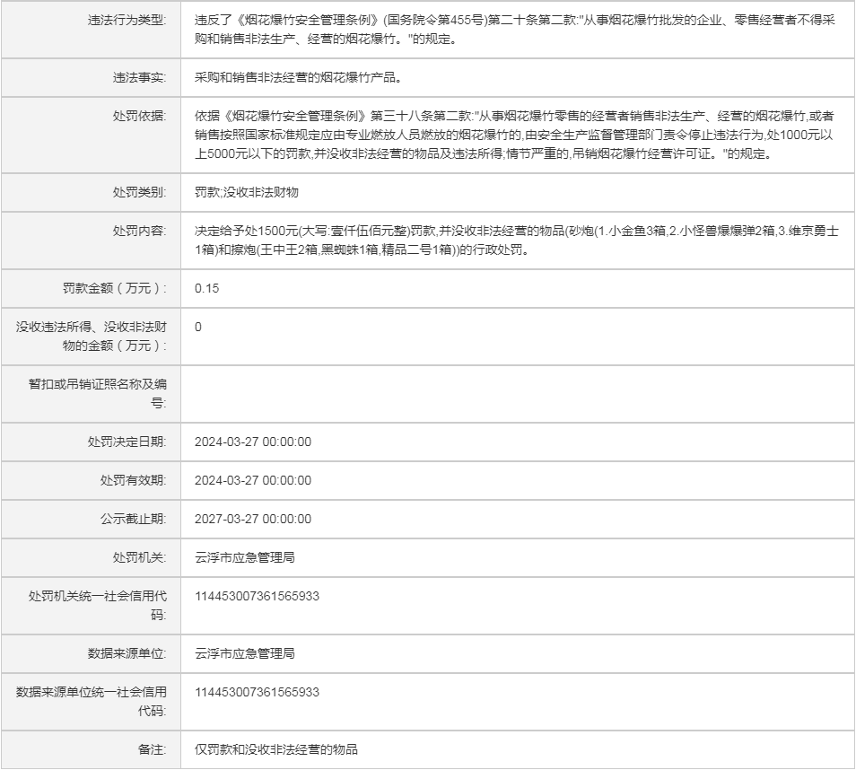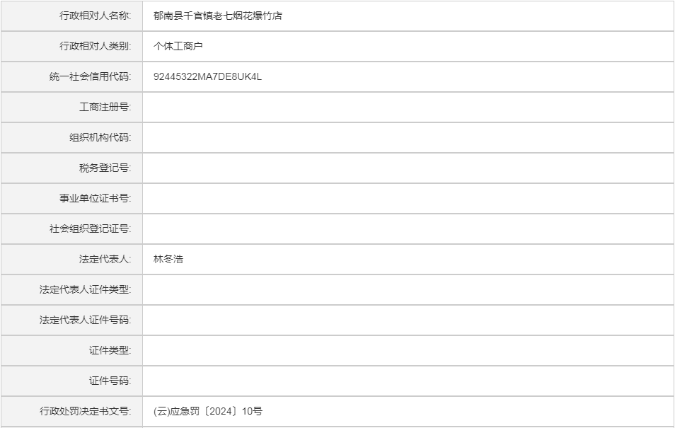 (云)应急罚〔2024〕10号郁南县千官镇老七烟花爆竹店行政处罚案