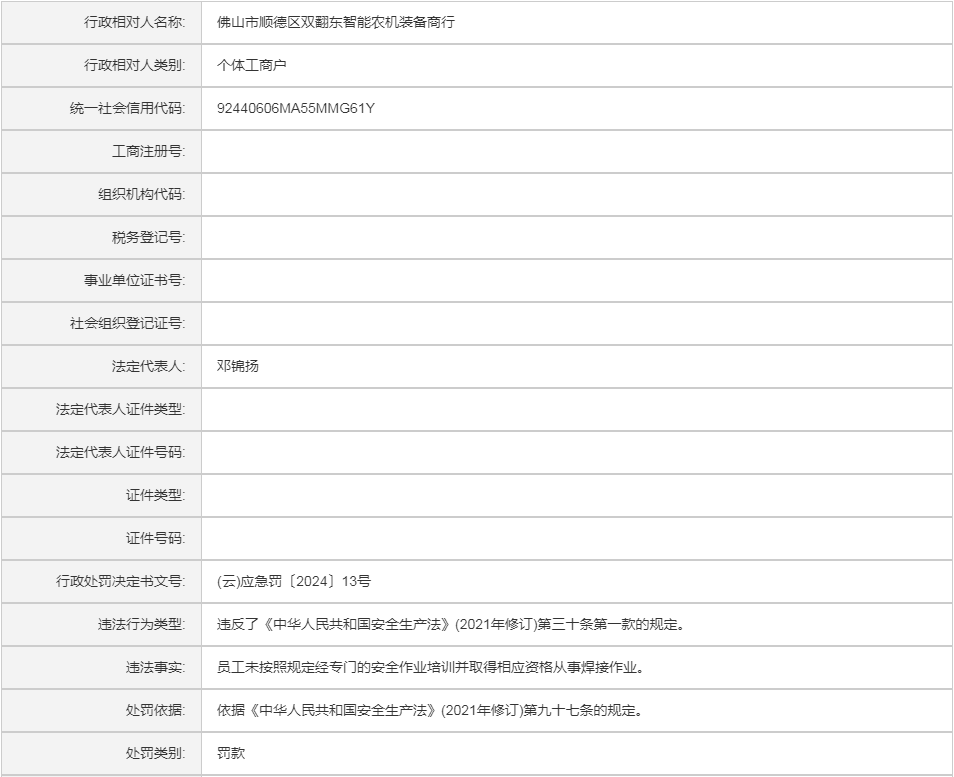(云)应急罚〔2024〕13号佛山市顺德区双翻东智能农机装备商行行政处罚案