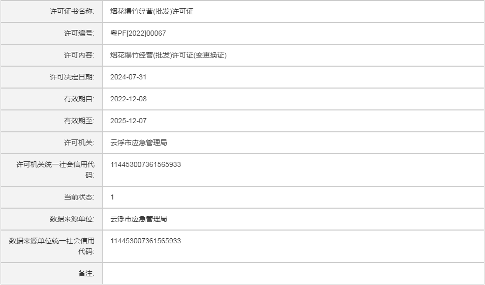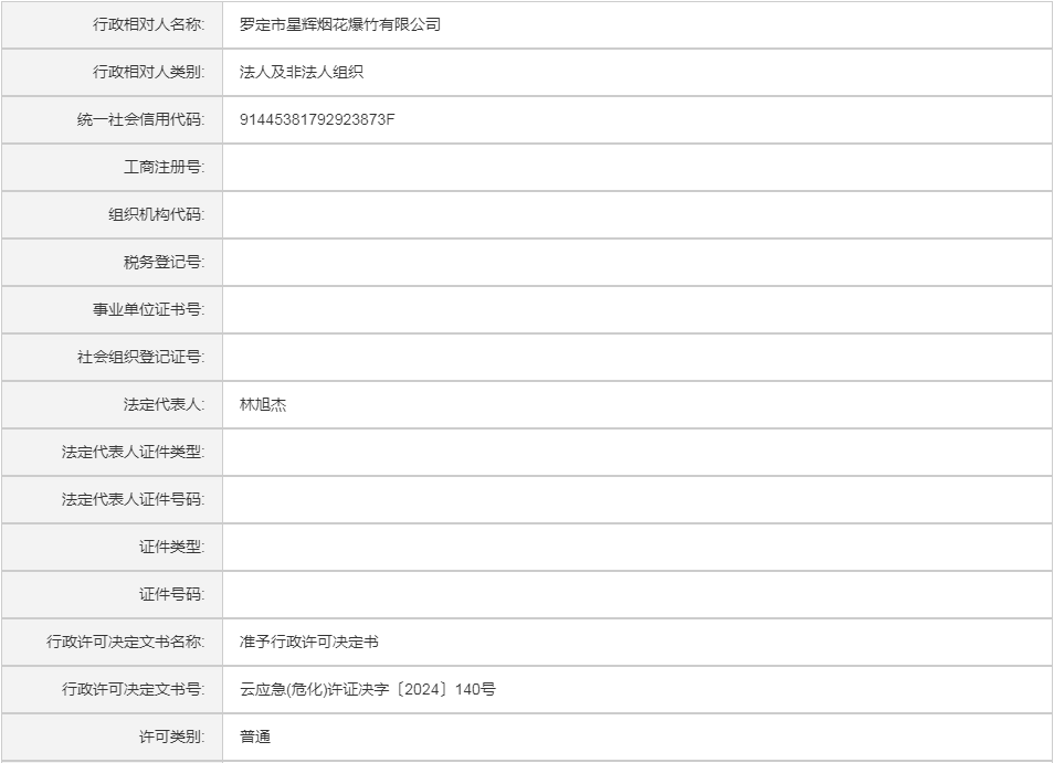 云应急(危化)许证决字〔2024〕140号罗定市星辉烟花爆竹有限公司烟花爆竹经营(批发)许可证(变更换证)